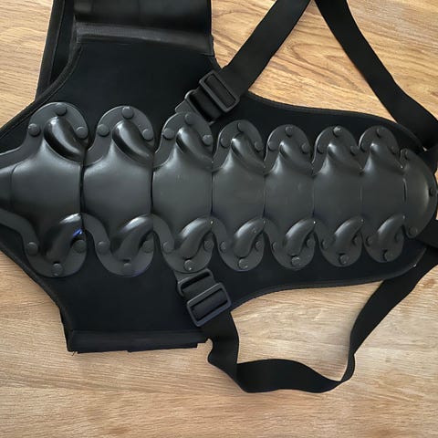 Ukendt rygbeskytter i sort farve med justerbare stropper. Beskytteren er designet til at give beskyttelse til ryggen under aktiviteter, hvor der er risiko for skader.