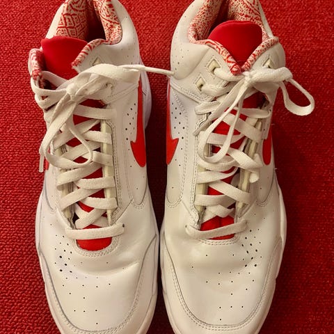 Nike Kobe Bryant sneakers i blå og rosa farver. Skoene har en lav profil og er designet til sport og fritidsbrug. Indvendigt er der håndskrevne noter, hvilket kan indikere en personlig tilpasning eller hyldest.
