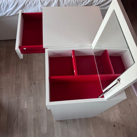 Rigtig fint lille bord til pigeværelset. Bordet står i pæn stand og eneste brugsspor er 4 små huller i venstre side, som vist på et billede.