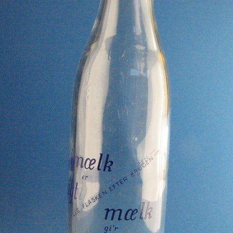 Flasker, 1/2 l. Mælkeflaske, eller flødeflaske i klar glas, Meget sjov og lidt speciel mælke flaske til en halv liter. Ser ikke ud til at have ridser eller skår, så det er et meget pænt eksemplar.