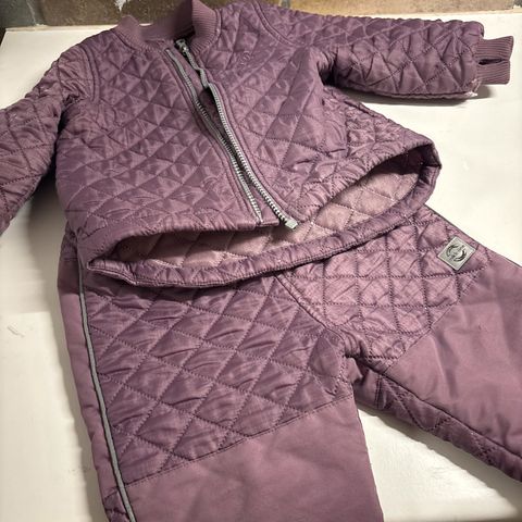 Milk-line termotøj str 122 i lys lilla. Bukserne har hul på knæet i det forstærkede lag, og så er der et lille hul på hvert arme ved en sugning samt at der er et hul ved forårsaget af lyslånsen oppe ved halsen. Det er alle små huller uden betydning for funktionen og derved stadig kan bruges til endnu et barn