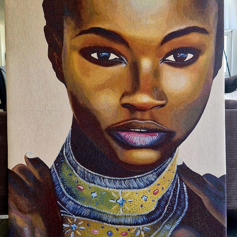 Avélie" . Varme farvetoner, er på canvas og måler H; 138 cm B 104 cm.