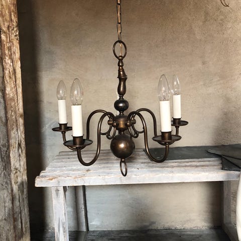 En femarmet krystal lysekrone højde 70 cm bredde 55 er gjort rent og virker fint vil gerne have den bliver hentet bor på Amager i nærheden af Metro og bus