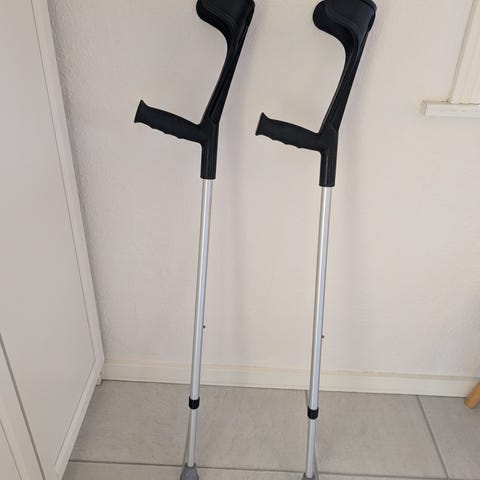 Aluminium krykker med justerbar højde. Letvægtsmateriale, velegnet til støtte ved gangbesvær.