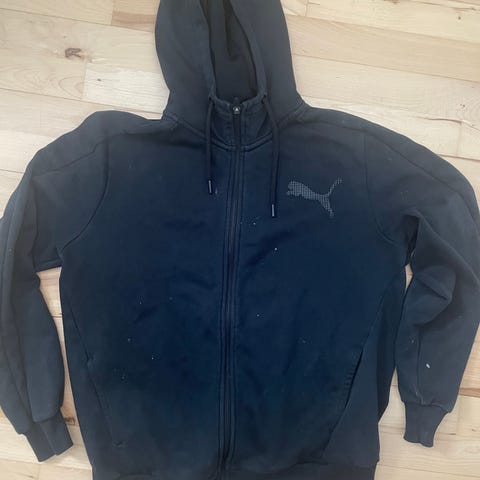 Rød hættetrøje med lynlås og lomme foran,har en sort stribe på ærmerne og der er snører i halsene . Længde:74 cm. Brystvidde :106 cm.