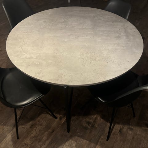 Jysk spisebord med grå bordplade og sort metalstel. Bordet har en rektangulær form med en overflade, der efterligner beton. Stellet er fremstillet i sort metal, hvilket giver bordet et moderne og industrielt look.