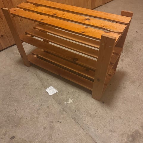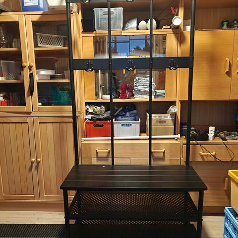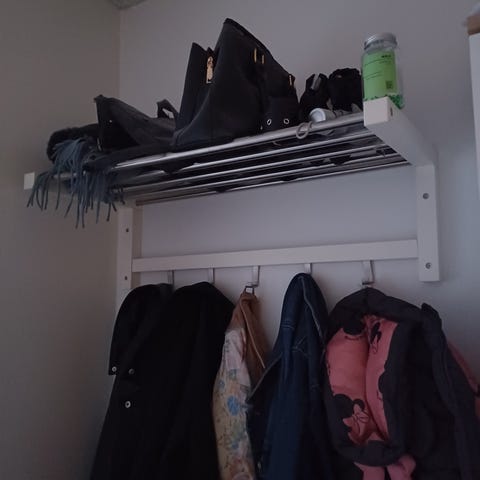Hylde med garderobestang og knager samt sko stativ
