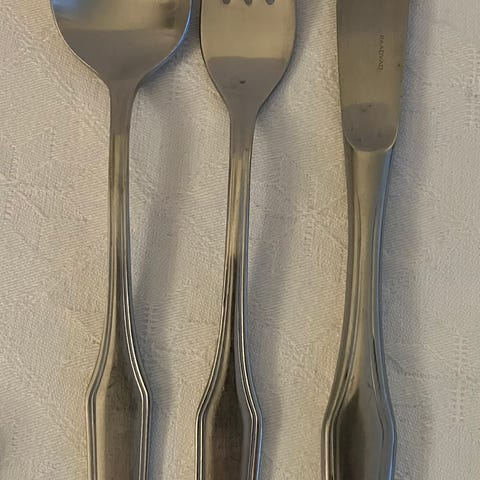 5 dele bestik i serien Christina fra Raadvad sælges. Der er 1 middagskniv, en serveringsske, en ske og 2 teskeer.