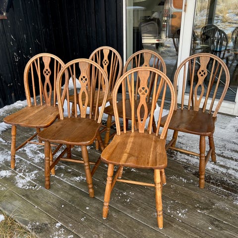 Arvet af min mors moster men har ikke plads til dem. Hvide med dejlig stort lakeret sæde. Meget behagelige. Har skrammer fra brug men ellers er de tiptop.