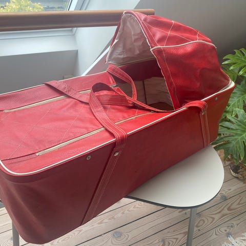 Virkelig fin gammel flettet babylift. Ville nok ikke bruge den til at bære baby rundt i men er virkeligt fint til at sove i derhjemme