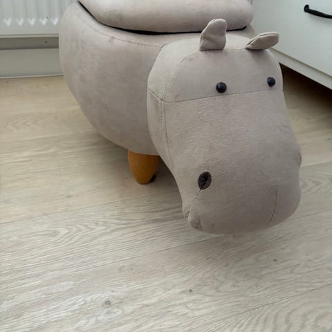 Bemærk ridsen på flodhestens kind, hvilken har gjort den ikke er sat på som ny, på trods af, at den er ubrugt.