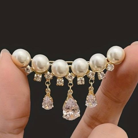 Meget yndig forgyldt broche med en masse hvide perler. Brochen er 5 × 5 cm og den er helt ny