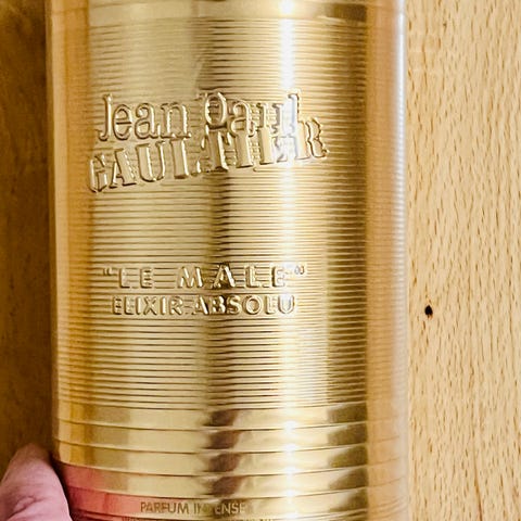 Jean Paul Gaultier Le Male Parfum i en flaske formet som en torso. Parfumen kommer med en sort og gul emballage samt en rød fløjlsfod til flasken.