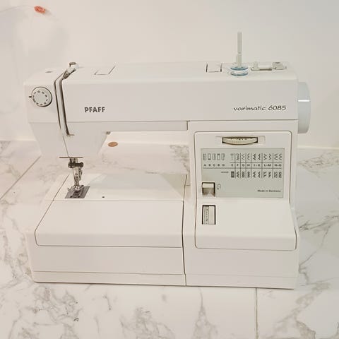 Pfaff symaskine med diverse trådspoler og fodpedal. Maskinen er beregnet til syning og leveres med brugervejledning.