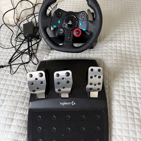 Logitech G29 Driving Force er et rat og pedalsæt designet til brug med PlayStation 3 og PlayStation 4. Sættet inkluderer et ratt med flere knapper og et pedalmodul med gas, bremse og kobling. Der medfølger også et separat gearskifte til manuel skiftning. Farven er primært sort, og materialerne omfatter plastik og metal. Produktet er beregnet til gaming og simuleringskørsel.