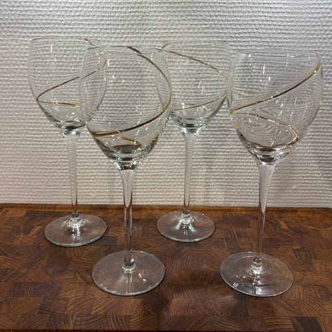 Kosta Boda Gold Line vinglas designet af den svenske glaskunstner Anna Ehrner. Glassene er mundblæste i Småland og med en karakteristisk elegant tynd glastråd, der snor sig omkring glassene. 1. sortering og fremstår som nye uden revner, skår eller glaspest, aldrig brugt.