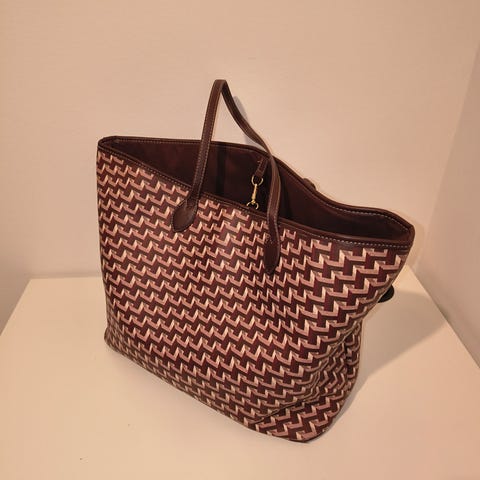 Primark bag in green. The bag features a distinctive geometric pattern. Similar to the designer version, the bag also features a small detachable pouch for any extra cards or cosmetics you want to keep separate. Magnetic snap closure.