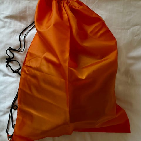Blå snøresæk lavet af kraftigt nylon materiale. Den har snørelukning og er velegnet til opbevaring eller transport af forskellige genstande - f.eks. som cargobag til mellemstore rygsække.
