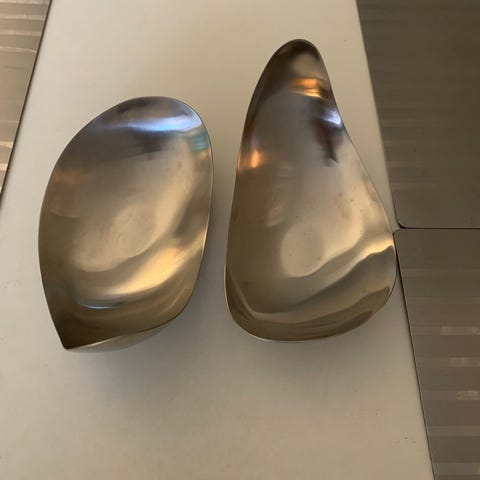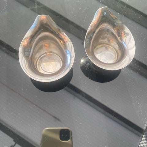 Georg Jensen salt- og peberbøsser i rustfrit stål. Sættet består af to dele med en rund og moderne form. Materialet er rustfrit stål, velegnet til borddækning og krydderihåndtering.de er i rigtig fin stand