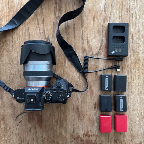 Sony A7 II camera with a Tamron 28-75mm f/2.8 lens. Includes three batteries, a charger, and a travel bag.