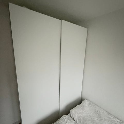 IKEA PAX garderobeskab i hvid med flere hylder, skuffer og stang til ophængning af tøj. Skabet er pakket ind i beskyttelsesfolie og fremstår uden synlige skader.