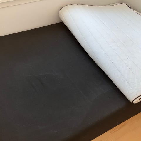 Fin boxmadras med Topmadras; mål 140 x 200. Plads under sengen: 22 cm (nok til bedrollers).