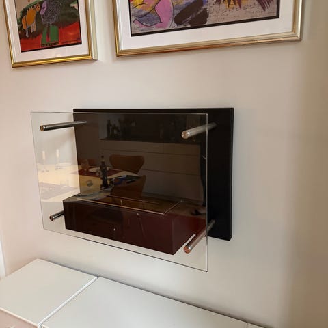 Væghængt biopejs med sort metalramme.