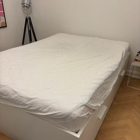 IKEA bed brimnes 140x200, with signs of wear (see photos, I photographed everything) and without handles for the drawers because I always opened them that way. In addition, there is a slatted frame that is called "leirsund" and is no longer sold in Denmark, but is better than the Lönset slatted frame from Ikea. It is sold without a mattress! The slatted frame can theoretically be purchased separately for 400 DKK.