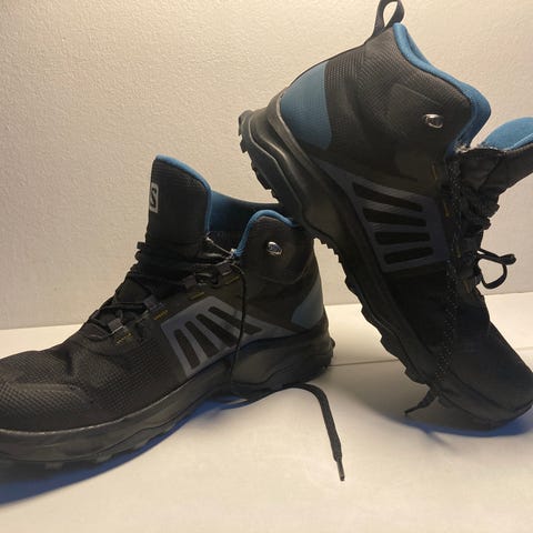 Salomon støvler i størrelse 41 1/3. Farven er en kombination af grøn og sort med gule detaljer. Fremstillet med snørelukning, Gore-tex og med en robust sål. Velegnet som vandrestøvle.