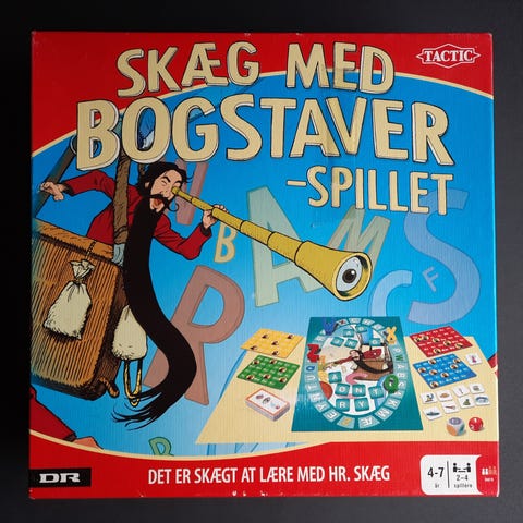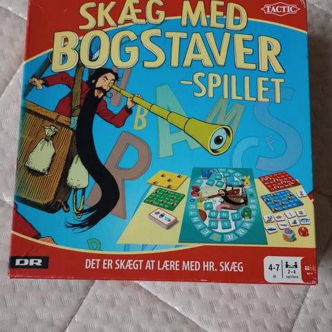 Skæg med Bogstaver spil med forskellige brikker og spilleplader. Spillet indeholder bogstavbrikker, spilleplader, og andre tilbehør til bogstav- og ordspil.