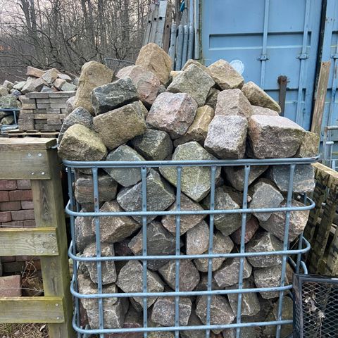 Granitsten, 15 paller, 15 paller med blandet gl. brugt granit, kantsten, kurvekantsten, bodursten og trappesten.
