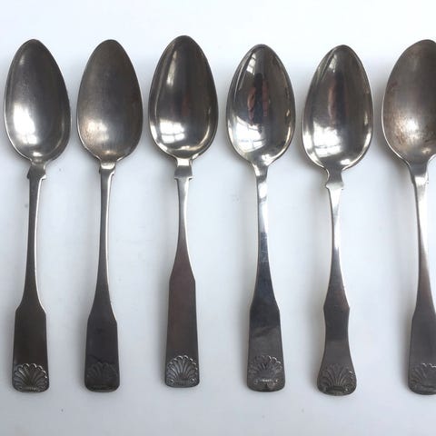 6 danske “Musling” sølv spiseskeer, 18,5 cm. To tårne. Vintage. Arvestykke.