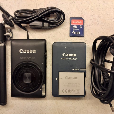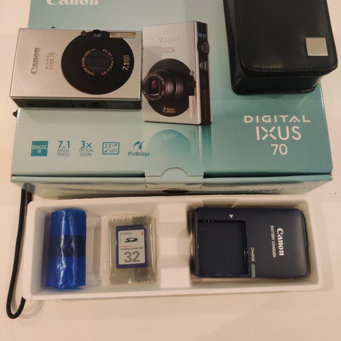 Digital kamera med batteripakke, batterioplader, interfacekabel, AV kabel, brugsanvisning, cover. Virker perfekt.