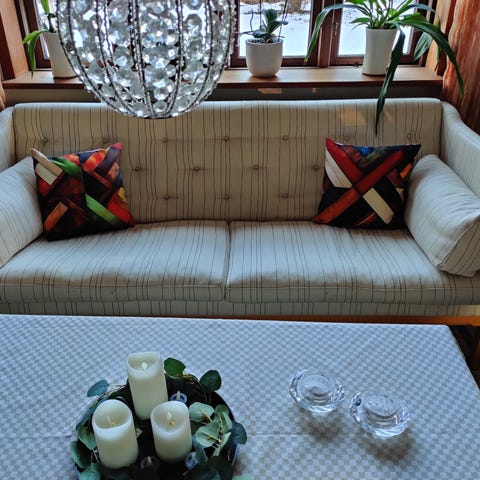 Jeg sælger dette sofasæt for mine forældre. Det er i teaktræ. Stoffet er grå/grønt uld. Der er desværre en plet på bordet..
