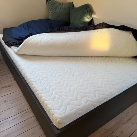 Madrassen er ca. 10 år gammel og brugt hyppigt, men den er velholdt og fejler absolut ingenting. Er altid blevet brugt med topmadras så ingen direkte berøring. Eneste fejl er de små skjolder på den ene side (se billede), men efter min mening gør de ikke noget.
