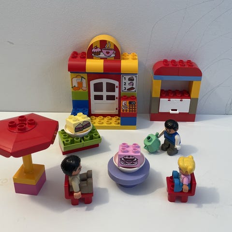 To små børn, en dreng og en pige er på cafe. De skal have flødeskumslagkage. Man kan få meget andet, f.eks. juice, æbler, appelsiner, jordbærfrugt og tomater. Man kan få mange forskellige kager og endelig pølser og grillspyd. En dame med fin perlehalskæde sørger for dem.