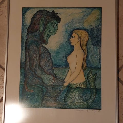 Litografi , motiv: Troldekys, b: 40 h: 50, Trolde i stærke glade farver.. med ramme i fin stand.
