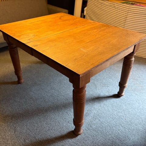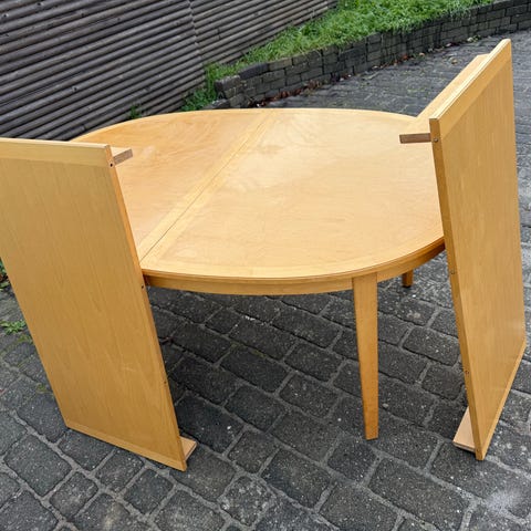 Solidt antikt udtræksbord i træ med rund form og lyse farver.