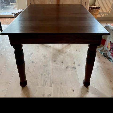Bordet har udtræksfunktion, der giver mulighed for at forlænge bordpladen helt op til 365m! Overfladen viser brugsspor og mindre skader, herunder to huller i bordpladen (se billede). Benene er dekorerede med riller og detaljer. Messing sko på bordben.