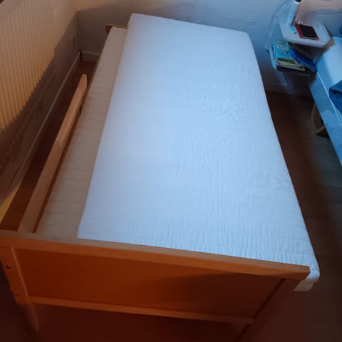 IKEA seng med lamelbund i træ. Sengen har en enkel ramme og lamelbund, hvilket giver støtte til madrassen. Materialet er træ, og designet er funktionelt til daglig brug.