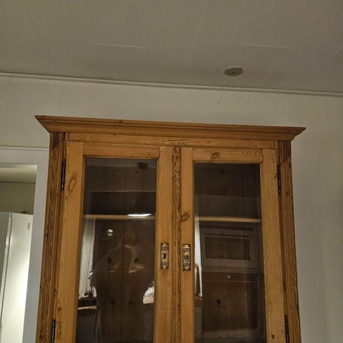 Amaretta hjørneskab i antik hvid og antik patineret. Antik hvid, er en farve der er en smule gullig i det.