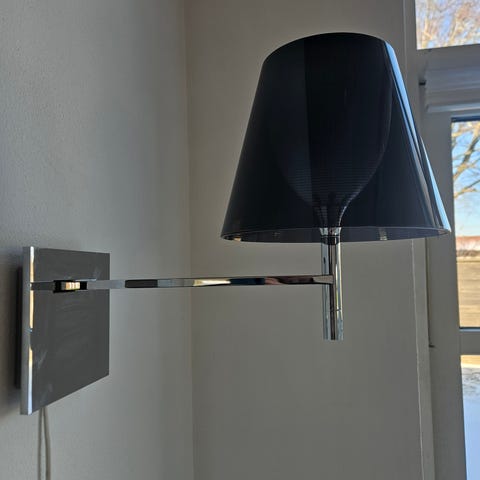 Flos gulvlampe med røgfarvet skærm og krom stander. Designet af Philippe Starck.
