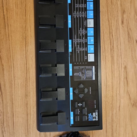 Boss ME-6 Guitar Multiple Effects. Købt engang tilbage i 90’erne. Den fungerer fint, men den originale strømforsyning er gået tabt i en flytning - deraf den lave pris.