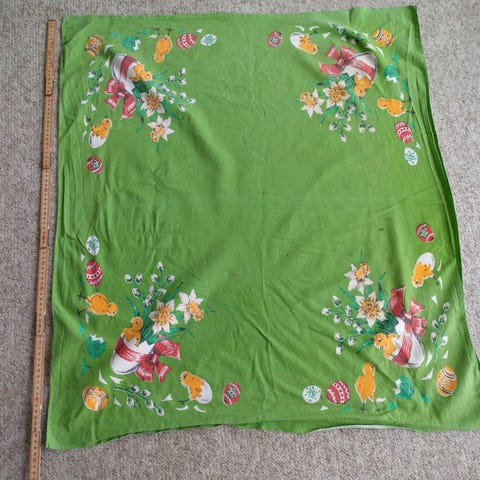 Foto 9-11 : stor grøn bomulds dug med trykte kyllinger, haner og æg i mange farver.. 85 kr.