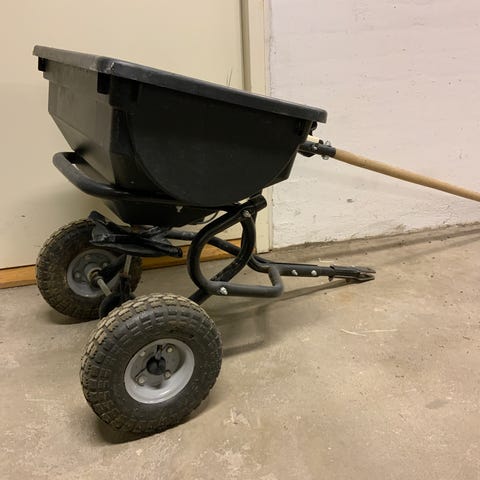 Agri-Fab Speed-Fan spredervogn med plastikbeholder og to hjul. Designet til nem påføring af gødning, frø eller salt. Passer til montering bag på havetraktor eller plæneklipper.