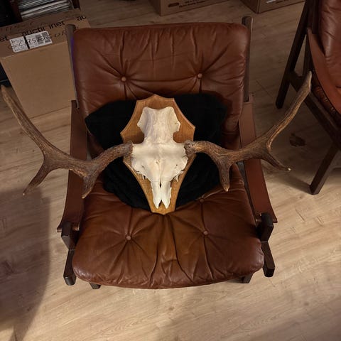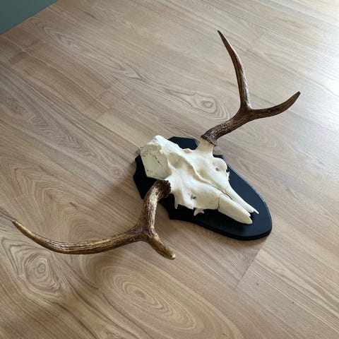 Elggevir med kranie til vægophæng. Geviret er stort og naturligt med flere takker på hver side. Monteret på en træplade til nem ophængning på væggen. Velegnet som dekorativt element i hjemmet.