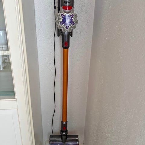 Dyson V8 Absolute trådløs støvsuger med gul stav. Støvsugeren er designet til effektiv rengøring uden ledning og inkluderer flere mundstykker til forskellige rengøringsbehov. Batteridrevet med genopladeligt batteri og tilhørende oplader. Velegnet til hjemmet til rengøring af gulve, tæpper og møbler.
