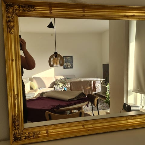 Spejlet har en ramme i mørkt træ med fine detaljer og en ornamenteret top i messing. Selve spejlet er facetslebet.,Afhentes i:,Røde Kors Tuborgvej / København NV (101),Bemærk at mail, chat og beskeder ikke besvares, og varen skal købes på knappen "Gå til varen"