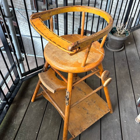 Retro høj stol til børn. Den kan slåes ud til legebord med hjul. Der mangler sikkerhedskrogen bag på stolen. Den kan også bruges som dekoration.,Afhentes i:,Røde Kors Tuborgvej / København NV (101),Bemærk at mail, chat og beskeder ikke besvares, og varen skal købes på knappen "Gå til varen"