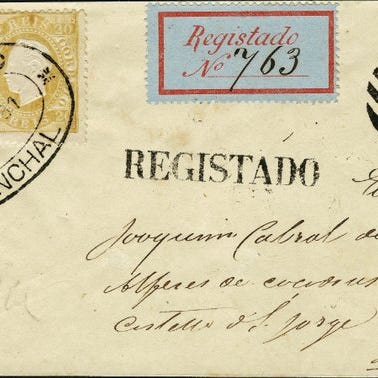 Saint Antoine 200 reis blå, afstemplet med Funchals runde stempel den 29. juni 1895, (disse frimærker har været i omløb fra den 13. til den 30. juni 1895) på et anbefalet brev fra Madeira-øen til Tyskland